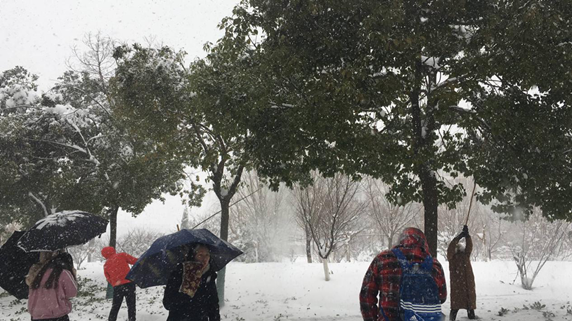 近两日,蚌埠地区出现大到暴雪天气,校园内树木积雪情况严重,容易引发危险。为预防校园安全隐患,保护校园树木,2018年1月4日,太阳集团tyc151cc学生第一支部党员在支部书记潘兰香老师的带领下,开展校园树木积雪清除活动。