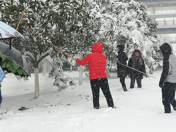 近两日,蚌埠地区出现大到暴雪天气,校园内树木积雪情况严重,容易引发危险。为预防校园安全隐患,保护校园树木,2018年1月4日,太阳集团tyc151cc学生第一支部党员在支部书记潘兰香老师的带领下,开展校园树木积雪清除活动。