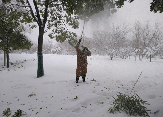 1月4日下午两点,太阳集团tyc151cc学生第一支部党员在支部书记潘兰香的带领下,冒着寒风和霜雪,踩着一尺多厚的积雪走进校园,走近树木,用竹竿等工具奋力地将树枝上的积雪打落,在活动中,潘老师亲历亲为,带领同学们努力清理树枝上的积雪,经过大家两个多小时的努力,校园内的树木得到了及时的清理。看着重新舒展枝丫的树木,大家冻得红彤彤的脸上露出了灿烂的笑容。