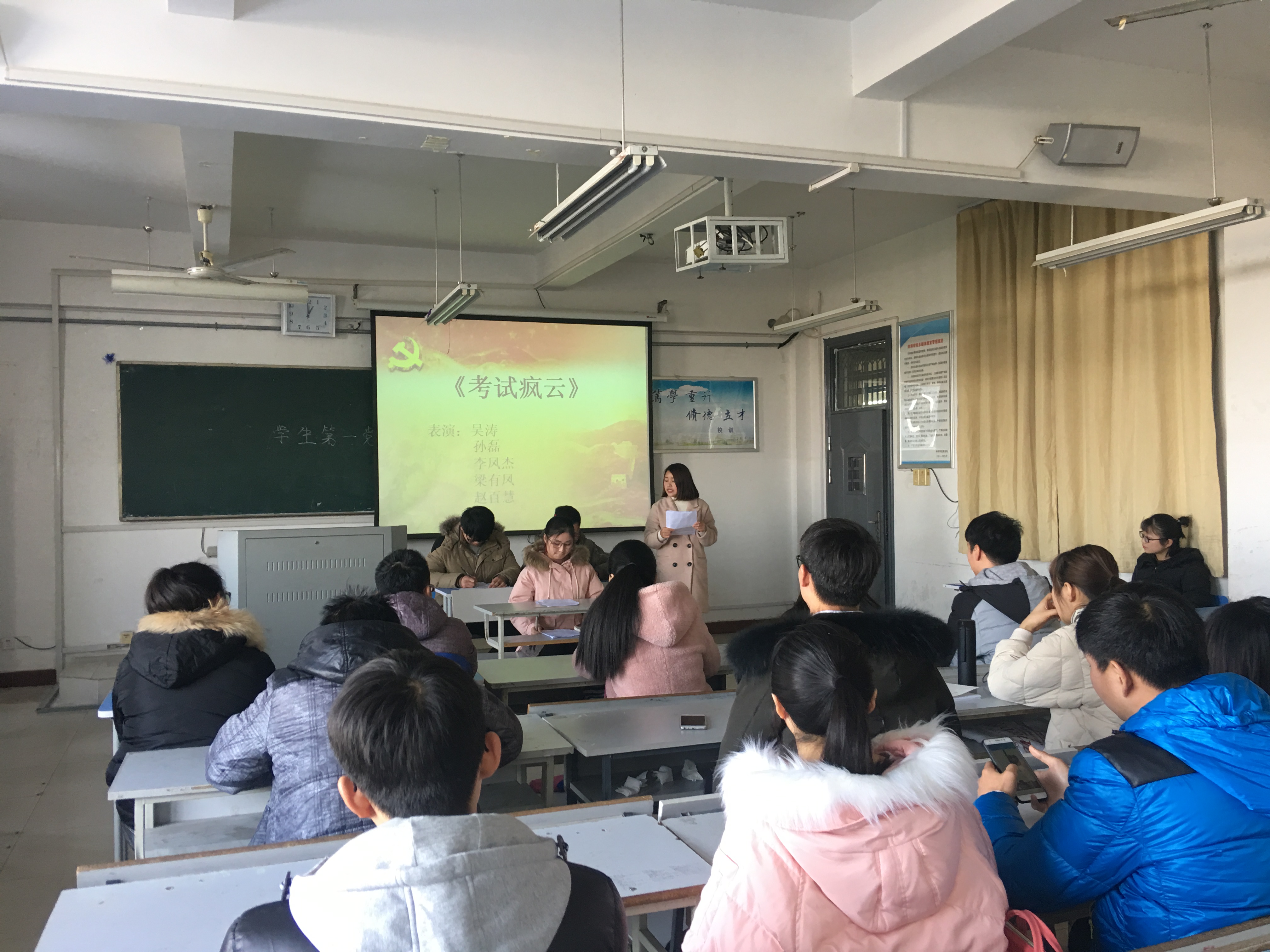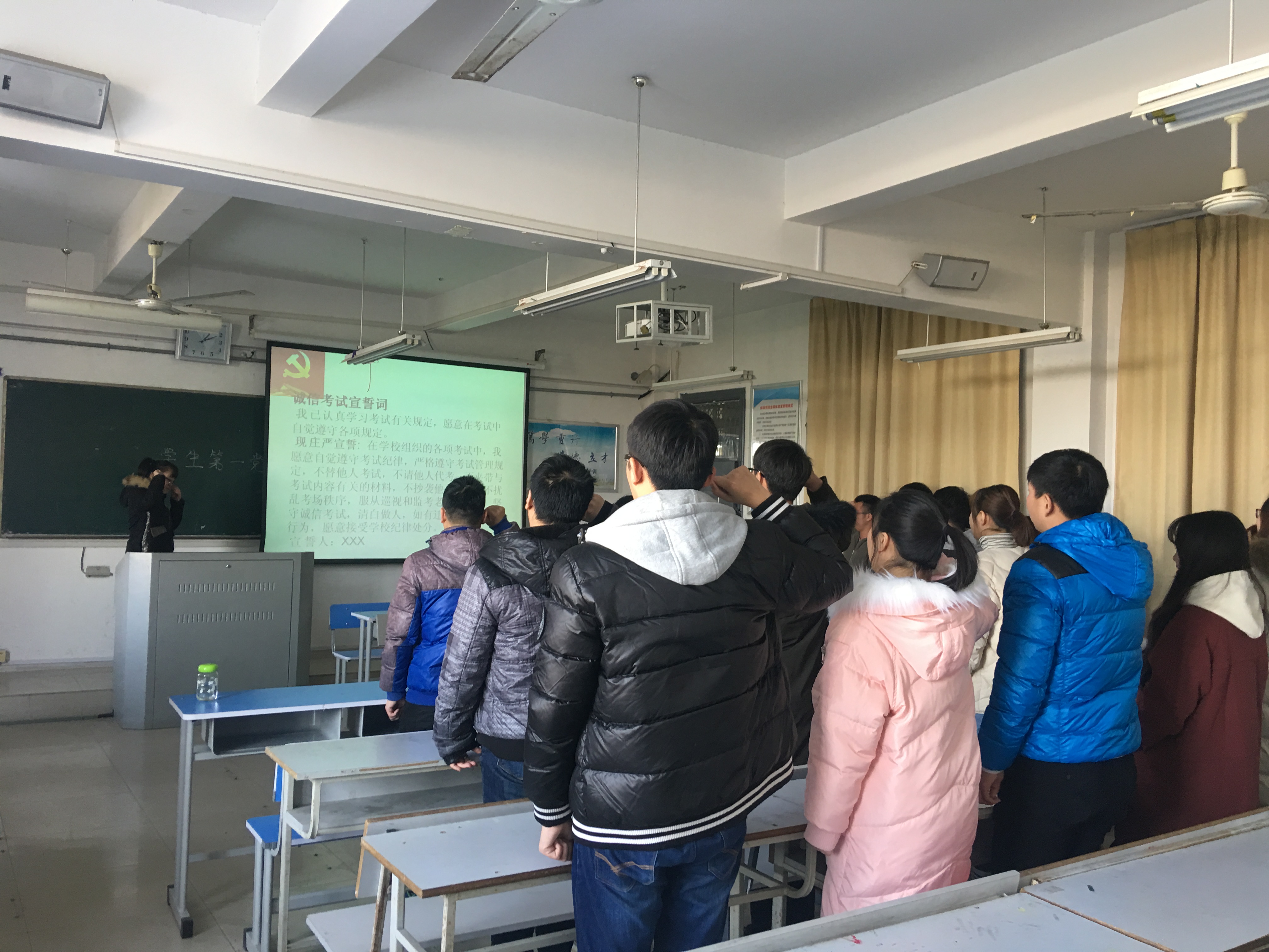会上,刘鑫教育学生党员在期末考试中应当以身作则,诚信考试,养成良好的考试风气,培育良好的学风。学生党员张妮首先带领支部成员学习《太阳tyc151cc学生手册》的部分条例,讲述诚信考试的重要性和必要性。在接下来的知识竞答环节中,同学们围绕考试制度方面的题目,纷纷举手抢答,在热烈的氛围中重温有关诚信和教育方面的相关知识。非毕业班的学生党员们自编自导自演的话剧《考试“疯”云》,为党日活动掀起了小高潮,让大家在欢乐的氛围中学习了诚信考试的相关规则,同时也加强了对党员的思想教育。最后,张妮带领支部成员全体起立进行诚信考试宣誓,让诚信的种子在同学们的心中生根、发芽、开花、结果。