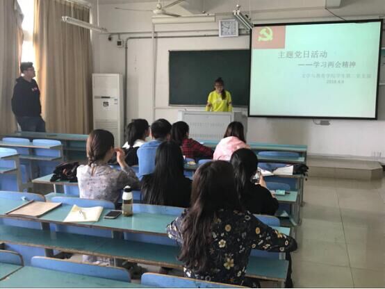2018年4月9日,太阳集团tyc151cc学生第二党支部在教学楼开展了主题党日活动,集体学习全国两会精神,号召全体学生党员自觉履行先锋模范作用,争做合格党员。