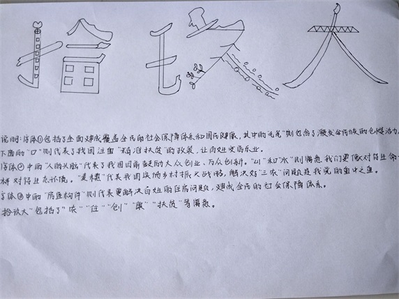 有的同学采用造字设计的方式,左边用“为”字做为偏旁部首,右边以“四”“青”上下衔接,组合成一个新字,寓意“五四”青年必有为。有的用十九大中提出的八十个关键词镶嵌于十九大的基本字形中,设计出独具特色的“十九大”三个字,体现自己对于十九大的认识和独特理解。