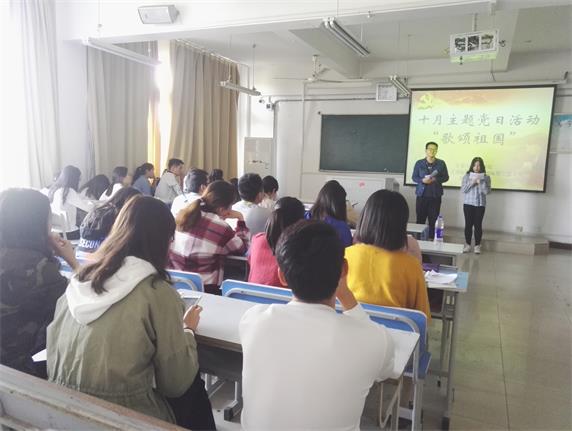 作为支部书记,潘兰香和刘鑫老师强调开展此次活动的意义,表达了对此次活动的美好期待。主持人赵百慧和郑成明同志的精彩开场白拉开了此次活动的序幕。文教院学生党支部的成员为本次活动精心准备了形式多样、丰富多彩的节目,有《强军战歌》《战士为国守安详》《没有共产党就没有新中国》《我爱你中国》等革命歌曲的演唱,有郭思琪同学制作的视频《送给祖国母亲》,有声情并茂的《祖国啊,我亲爱的祖国》《我的祖国》《不能不爱我的祖国》等经典诗歌诵读,有和“十月”、“祖国”等主题词密切相关的猜谜游戏活动等,党员们的朗诵感情饱满,歌声激情澎湃,成功的带动了现场的气氛。