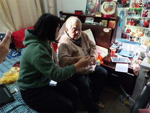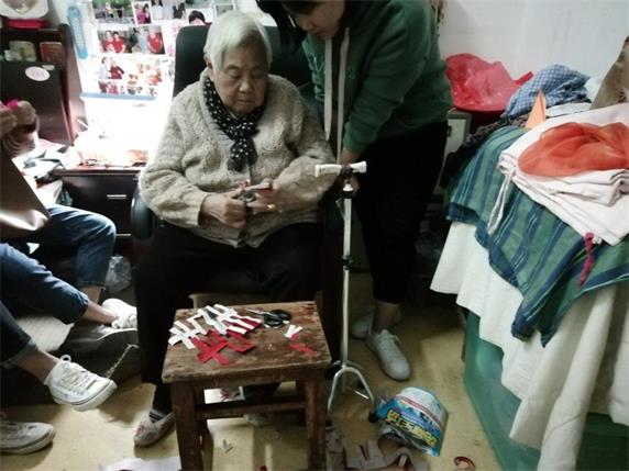 到达目的地后,活动负责人根据楼层所需人数、志愿者的兴趣爱好进行合理分配工作,使现场井然有序,有条不紊。部分志愿者来到三楼。张爷爷的房门早已敞开,等待着志愿者的到来。虽然时光的痕迹遮掩不住,但张爷爷精神抖擞尽显青春活力。张爷爷一一与他们握手,表示欢迎。随后张爷爷亲自帮每位志愿者带上他花数小时编织而成的红手链,并为它作曲填词“红丝线,色鲜艳。爷爷用它编手链,饱含深情与祝贺,万语千言在里面”。志愿者们为张爷爷送上相框,国画颜料,宣纸,希望张爷爷能够使用这些东西来增添生活的趣味。张爷爷感动地欲言又止,握紧志愿者的手,连道“感谢”。