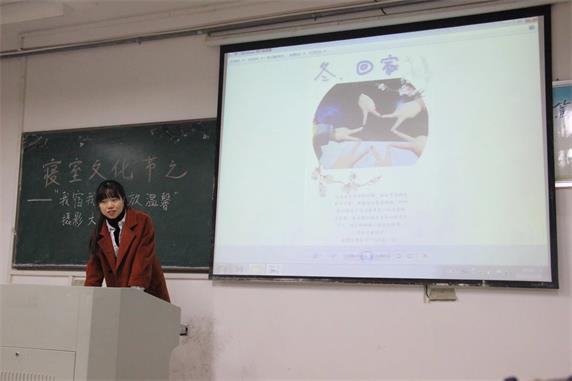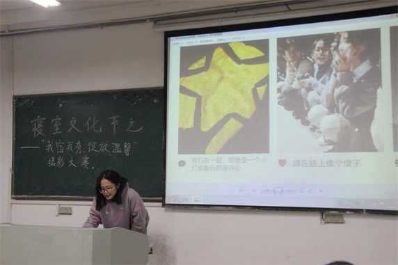 活动于11月16日晚七点在教室A113举行。晚上6时50分,参赛选手和评委陆续到场入座。在主持人详细地介绍了比赛规则后,比赛正式开始。参赛选手们按报名顺序依次上台将自己的摄影作品展示给大家。同学们的摄影题材丰富,内容多样:有的从小处着手,将目光锁定在自己的寝室内;有的善于观察,捕捉到校园里的风景;还有的敢于拓展,把镜头对准校外风光。