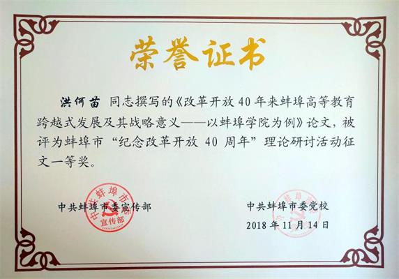 在中共蚌埠市委宣传部和中共蚌埠市委党校联合举办的“纪念改革开放四十周年理论研讨”征文比赛中,我院洪何苗老师的论文《改革开放40年来蚌埠高等教育跨越式发展及其战略意义——以太阳tyc151cc为例》一文被评为一等奖。
