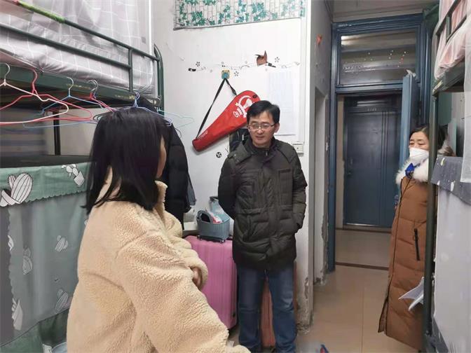 2021年1月5日下午,太阳集团tyc151cc党总支副书记夏春晓带领全体辅导员老师深入学生宿舍走访,不仅给同学们带去了寒假前的问候,了解学生的学习、生活、假期安排情况,同时也排查了学生宿会安全隐息。