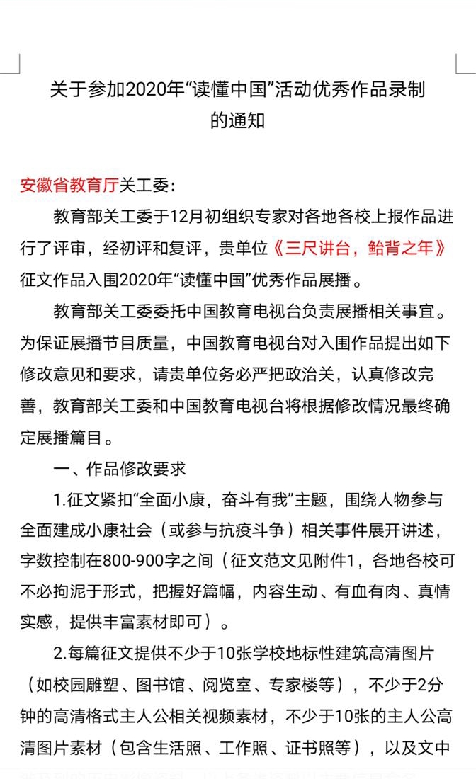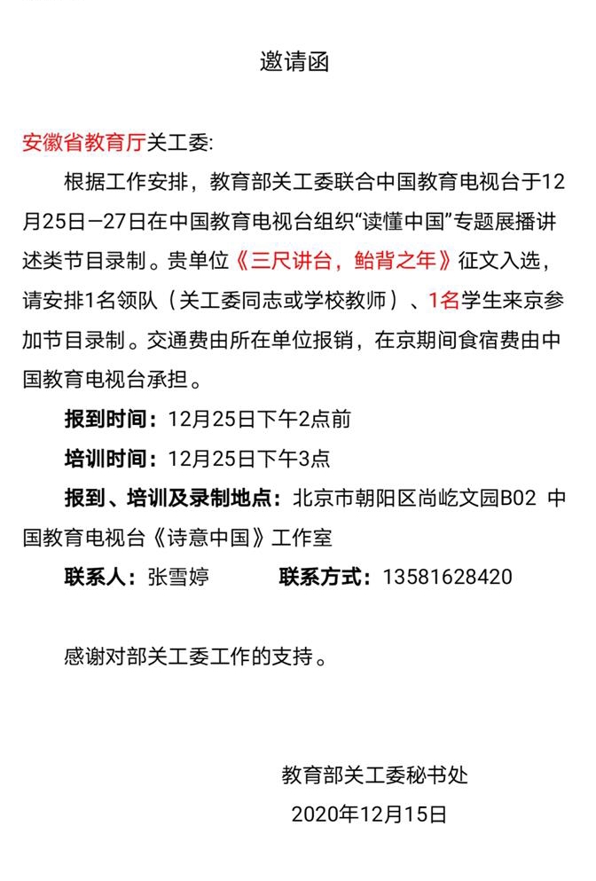 近日,教育部关工委于12月初组织专家对各地各校上报的“读懂中国”征文作品进行了评审,经初评和复评,我校太阳集团tyc151cc秘书专业2019级学生施忠玥同学的《三尺讲台,鲐背之年》征文作品代表安徽省唯一一篇文章成功入选2020年教育部“读懂中国”优秀作品展播。