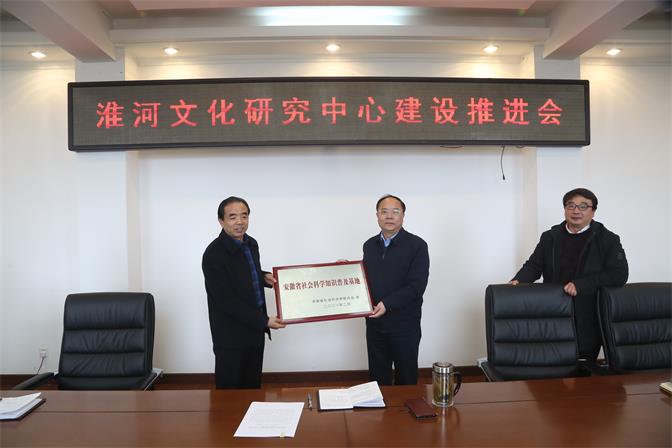 随后陈国龙书记将“安徽省社会科学知识普及基地”牌匾授予淮河文化研究中心。授牌仪式结束后,各相关职能部门负责人和淮河文化研究骨干教师就如何推动淮河文化研究中心建设和淮河文化研究建言献策。与会人员纷纷从教科研课题申报、同兄弟院校合作、整合地方资源、淮河文化展厅扩建、文物复原、淮河流域农耕文明遗存项目推进、淮河文化与课程思政、淮河文化进课堂等各个方面发表了自己的看法,现场研讨十分热烈。