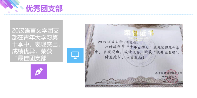 本次评选工作通过QQ视频会议方式开展,各参选团支部代表陆续以PPT展示和视频通话讲解的形式,分别从本支部的思想建设、组织建设、学风建设和团日活动等方面行了汇报。其中,2020级广播电视编导(1)班团支部用简短凝练的视频展示了其支部的精彩瞬间——团日活动、主题团会、学风建设等,传递出他们充满活力,班级团结的精神风貌;2020级汉语言文学本科团支部解说员介绍其支部荣誉的同时更是铿锵有力,充分展现了他们永不言弃的精神。