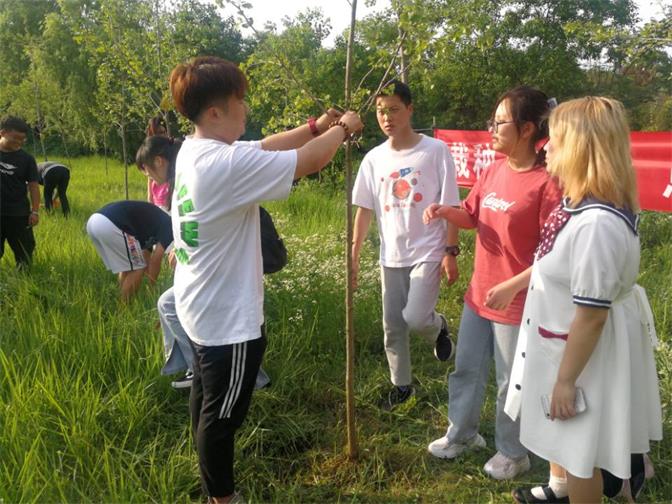 在给银杏树挂上全班同学写好的带有班级简介和祝福语的树牌后,各班同学开始给银杏树除草、松土和浇水。6月的骄阳丝毫没有影响同学们的热情,他们用铲子松土,用镰刀清理杂草。同学们在轻松愉快的氛围中,渐渐地将银杏树林中的杂草清除完毕。在挂牌、除草、浇水工作完成后,各班同学在银杏树林合影留念。