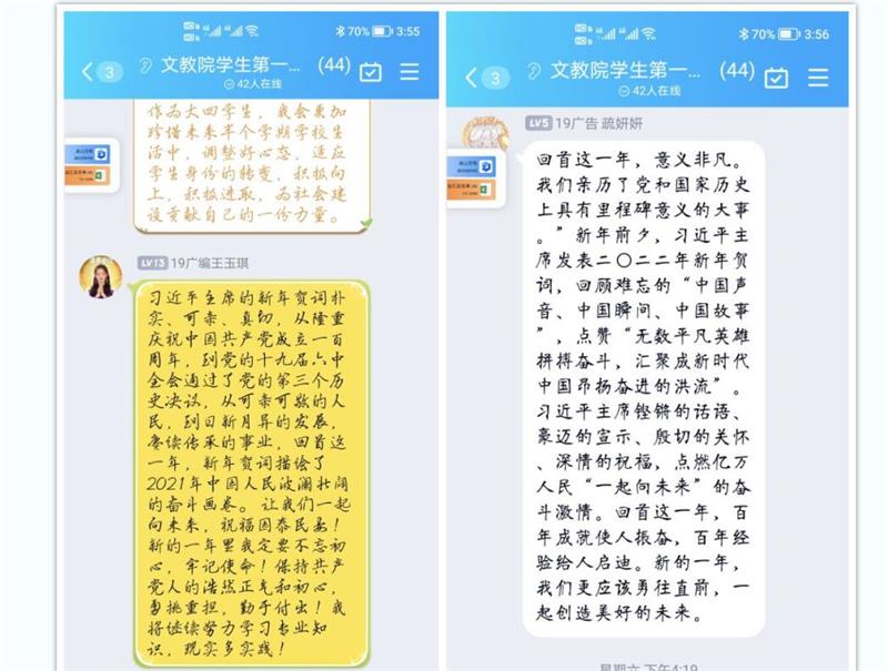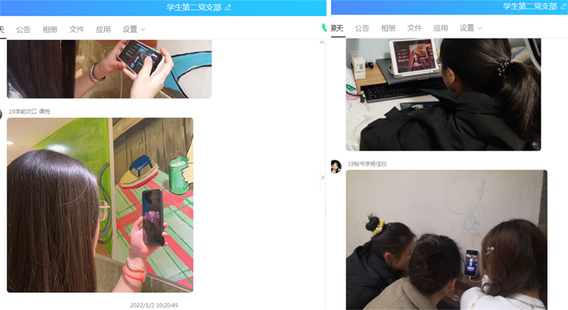 各党支部先是带领学生党员重温了重温习近平主席历年新年贺词,之后带领大家学习观看“2022年习近平主席新年贺词”,各支部在网上开展了热议。支部党员纷纷表示“习主席的讲话令人鼓舞、催人奋进”,“强国有我,是对祖国真情的告白;强国有我,是时代赋予我们这一代人的新使命”,“青年党员应踔厉奋发,勇毅前行,为人民谋幸福”。