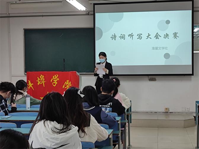 诗词听写比赛分为初赛和决赛两部分,均在B楼开展。初赛为笔试,选取笔试成绩前百分之三十进入决赛。初赛时,选手签到后进入比赛教室,比赛试题由淮星文学社全权负责。初赛排名前百分之三十选手进入决赛,五组一轮。决赛采取抢答形式,当主持人在ppt上展示完题目以后,选手们便可站起来进行抢答,先站起来的同学即可获得答题权,最终根据题目分值计算得分。等活动结束后,进行活动总结,主持人公布得分以及排名。