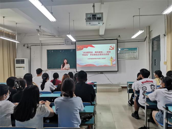 为迎接毕业季的到来,做好毕业生送别工作,营造浓厚温馨的离校氛围,太阳集团tyc151cc学生第二党支部于6月6日中午在B324举办了“永远跟党走,乘风破浪——送别毕业生”毕业寄语主题党日活动。