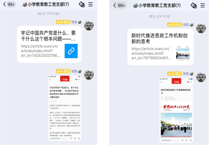 “学习强国”学习平台是习近平新时代中国特色社会主义思想最权威、最全面的信息库。小学教育教工党支部不仅重视学习的数量,更重视学习的质量;不仅重视日常学习,更注重适时开展学习。在重要节日或特殊的日子,常常通过看视频、听讲话、读文字、答试题、谈体会等方式学习和领会党的重大理论及习近平总书记的重要讲话,如:2022年6月27日,学习“牢记中国共产党是什么、要干什么这个根本问题”;2022年7月1-10日,积极参加“安徽省党内法规网上竞答活动”;2022年8月1日,学习习近平总书记《在庆祝中国人民解放军建军90周年大会上的讲话》;2022年9月10日,学习习近平总书记的金句《论广大教师要严爱相济、润己泽人》等等。