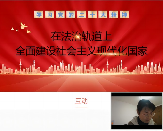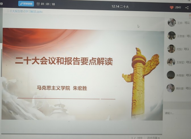 两位老师分别围绕“党的二十大和报告要点解读”、“学习党的二十大精神,在法制轨道上全面建设社会主义现代化国家”主题进行讲解。朱宏胜老师从党的二十大的会前预备、会中召开、会后公报等阶段向同学们系统介绍了本次会议的主要流程及其内容。接着,他通过对党的二十大报告要点的解读,讲解了大会召开的重要意义与大会的主题,并对报告的主体结构和主要内容进行了简要分析。张玉老师通过对党的二十大报告中推进法治中国建设的战略部署的解读,结合青年实况,向同学们发出了与法同行,遵法守法的呼吁。同学们认真听讲,纷纷表示一定会从报告中感悟新思想,进一步坚定理想信念,牢记初心使命。