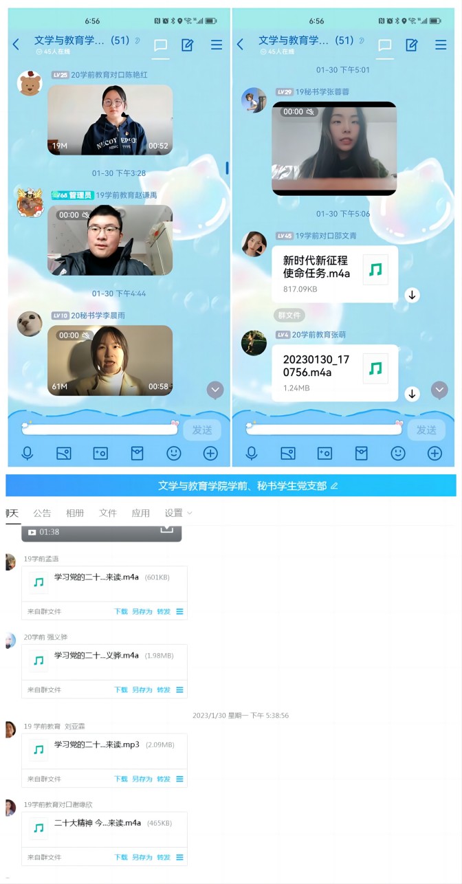 本次主题党日活动由党支部书记董琬如主持,支部全体成员参与。活动通知发布后,支部成员纷纷积极响应,以高涨的热情踊跃参加。活动当天,支部成员紧紧围绕党的二十大精神,以饱满的精神状态朗读二十大报告节选内容。其中朗读形式多样,有声情并茂的视频录制版,也有满怀感情的音频录制版,部分成员还根据自己的朗读内容、朗读音调选择了相适的音乐作为伴奏,大家在不同的朗读内容中传递出相同的听党话、跟党走的坚定信念。活动过程中,党支部成员们相互学习、欣赏其他成员的朗读音频,领悟朗读内容中传递出的精神理念,宣传贯彻党的二十大报告精神。