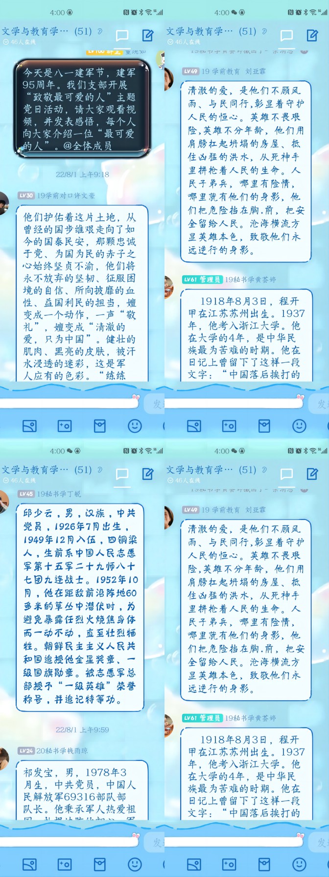 活动伊始,由党支部书记董琬如,组织支部成员学习观看“央视新闻”官微发布的“献给中国人民解放军建军95周年”视频,并转发相关新闻报道,向大家介绍在和平年代下,中国军人对祖国的忠诚、对人民的守护、对信念的坚定。接着,支部成员纷纷发表自己的学习感悟,表达对中国人民解放军建军95周年的美好祝福,对中国军人守护祖国、爱护人民的感激与钦佩,并彼此之间交流自己所了解到的“最可爱的人”。在交流中,成员们进一步了解到了守护当今和平年代的英雄及其事迹,如“逆向而行、甘为人梯”的孙宝嵩、“矢志报国、三巡太空”的聂海胜、“忠诚使命、英勇无畏”的杜富国、“科技强军、为国铸盾”的钱七虎等等,并从中再次感悟到了人民军队始终是党和人民完全可以信赖的英雄军队。最后,大家纷纷表达了对中国军人为国家、为人民英勇无畏、坚强不屈的崇高精神的赞美,以及内心对人民解放军的感激之情。
