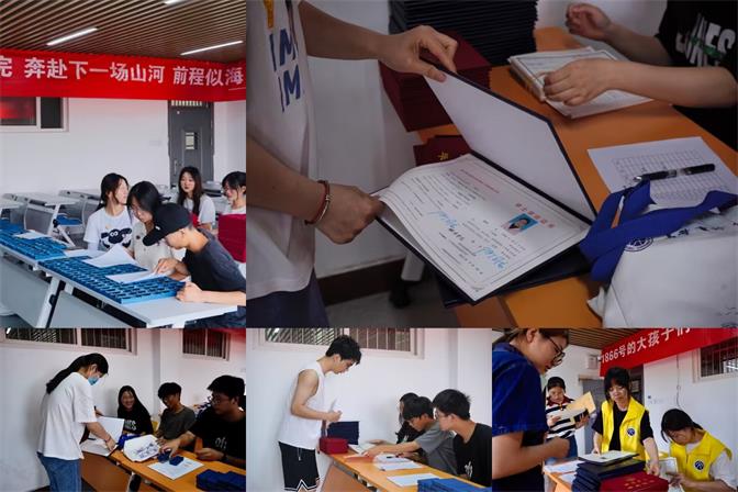 上午7点,工作人员进行了仪式现场的布置和装饰,拉起横幅,清理教室,将毕业证书、学位证书、纪念品等准备齐全,并在教学楼B楼设立了毕业签名墙。引导员按照活动前安排引导毕业生前往对应专业教室,发放离校通知单,领取毕业证书、学位证书、荣誉证书,以及包括刻有自己名字的专属钥匙扣、印有太阳集团tyc151cc字样的帆布包在内的毕业礼物。毕业生们领取物品后在签名墙上留下祝福,或是合影留念,并以自己的独特方式表达了对母校的留恋。最后,毕业生带着成才思源、毕业思进、感恩母校的情感文明离开了校园。