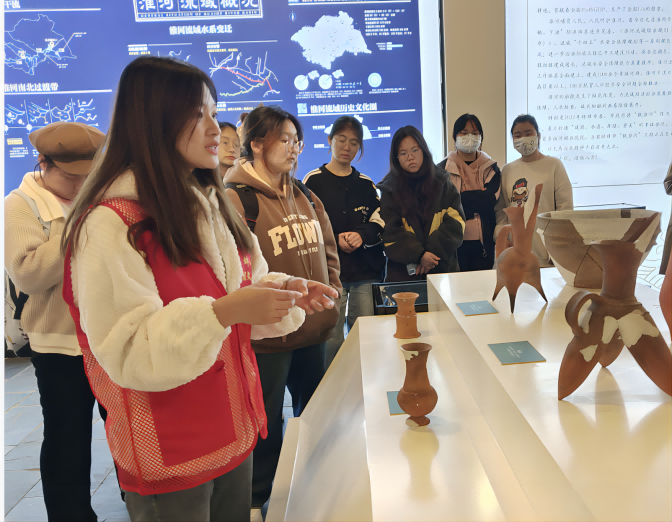 展览馆由四个展厅构成,分别是研究中心工作开展情况、研究中心取得的成果与部分实物展示、以淮河文化为主题创作的手工作品展示以及国家级非物质文化遗产花鼓灯文化展。每个展区都有讲解员进行详细介绍。在讲解员的引领下,同学们认真欣赏展厅展品,或拍照记录,或驻足同讲解员一同沟通交流,学习氛围热烈。