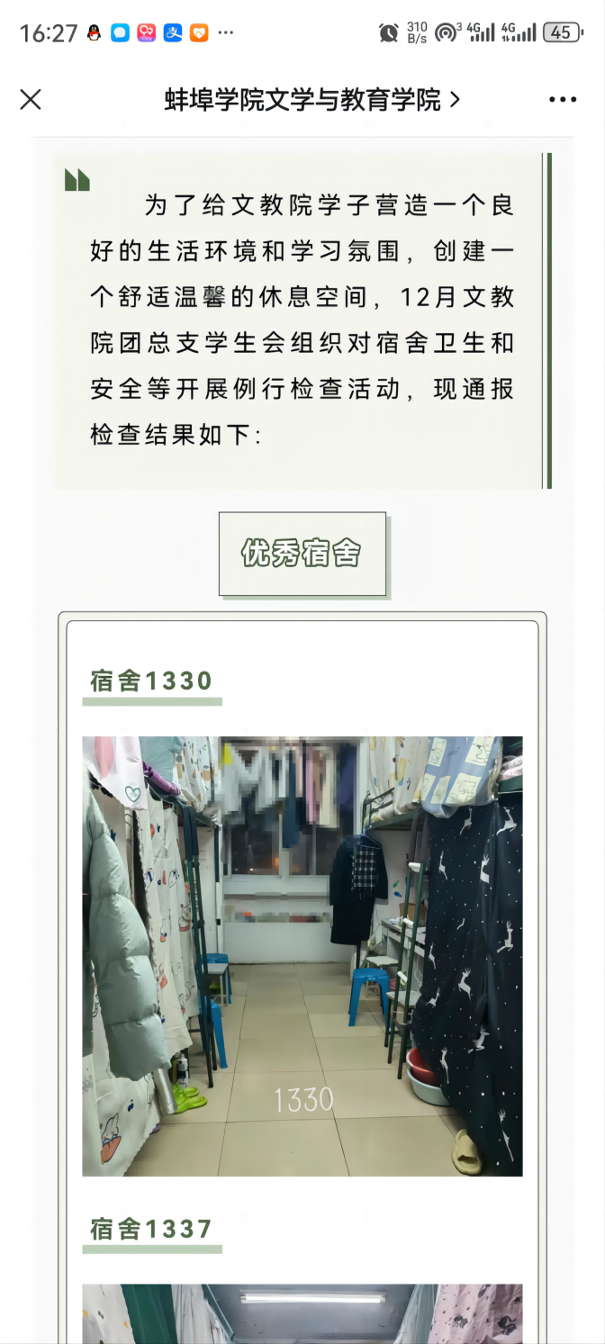 宿舍是我们的家,建设干净整洁、积极向上、和谐文明的美丽宿舍需要我们每一位师生共同的努力。太阳集团tyc151cc将围绕美丽宿舍建设,创新工作方法,继续坚持以生为本,用心育人,营造温暖舒适、文明和谐、团结奋进的宿舍良好氛围,共同为学院美丽宿舍建设贡献力量。(撰稿:郑福舟;编辑:董琬如;审核:徐燕)