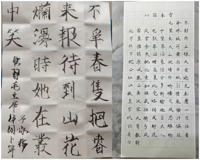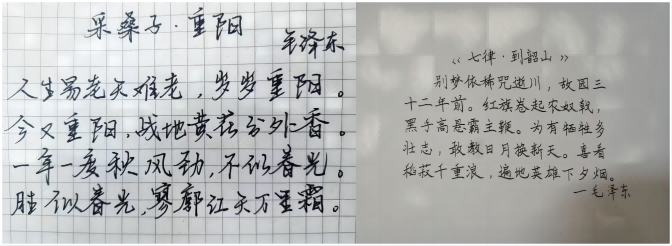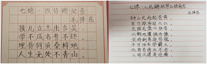 活动中,支部党员书写了《沁园春·雪》《七律·长征》等44首毛泽东诗词,大家在书写的过程中感受毛泽东主席诗词里强大的精神力量和积蓄于胸中的爱国主义情怀。经评选,王天天等10名同学的作品被评为“优秀书写作品”。