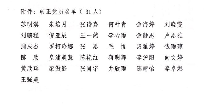 经党组织一年来的培养教育和考察,中共预备党员苏明淇等31位同志的预备期满,已向党组织递交书面转正申请。经支部大会讨论决定,拟将苏明淇等31位同志转为中共正式党员,现进行公示。