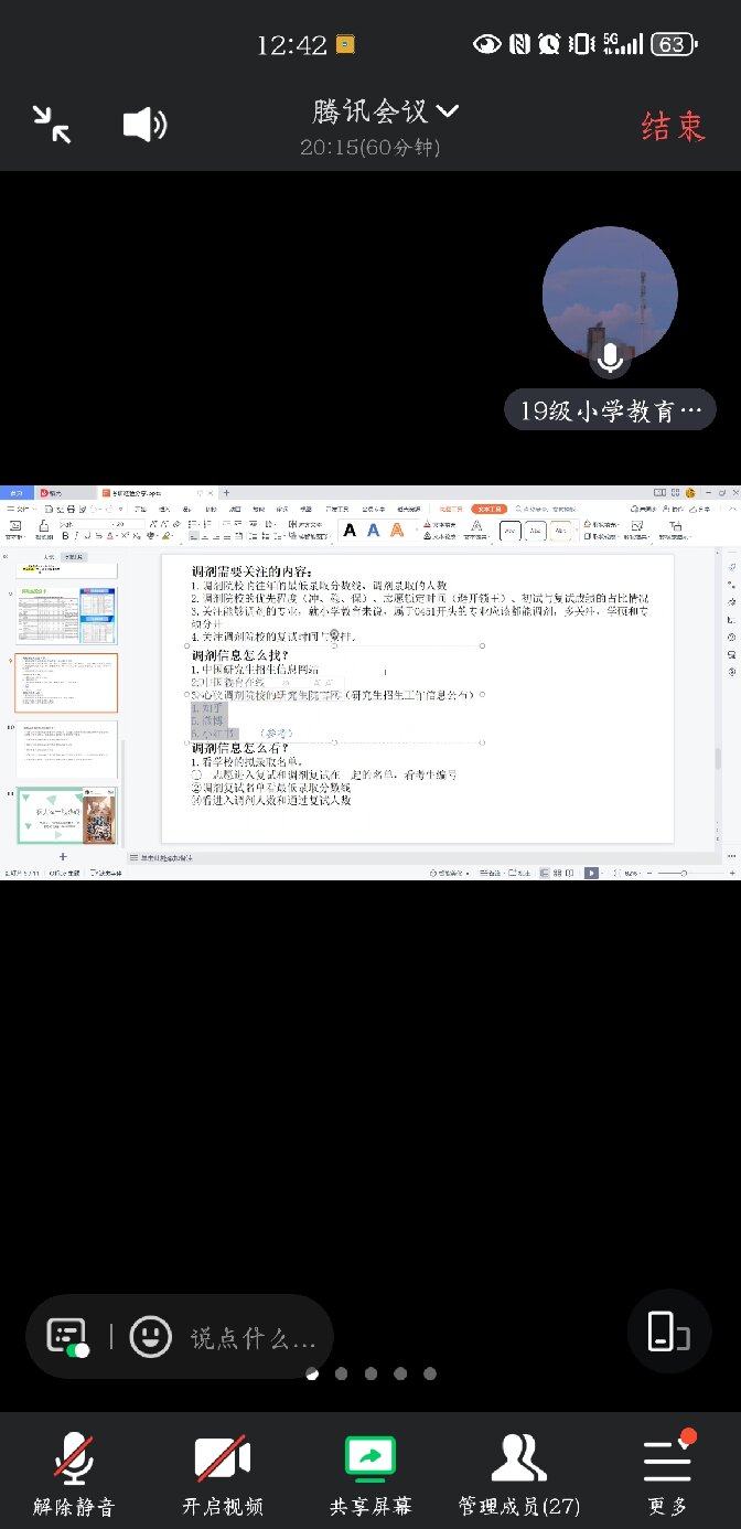 为帮助考研学子更好地了解考研复试的相关情况,太阳集团tyc151cc于3月13日举办了线上考研复试经验分享会。本次分享会邀请了2023届考研成功上岸的优秀学子小学教育专业王一然、广播电视编导专业 陈鑫琳、汉语言专业强甜甜、学前教育专业周群和广播电视编导青年教师强琦琦老师、辅导员郭天梅老师、辅导员王晓天老师进行经验交流与分享。