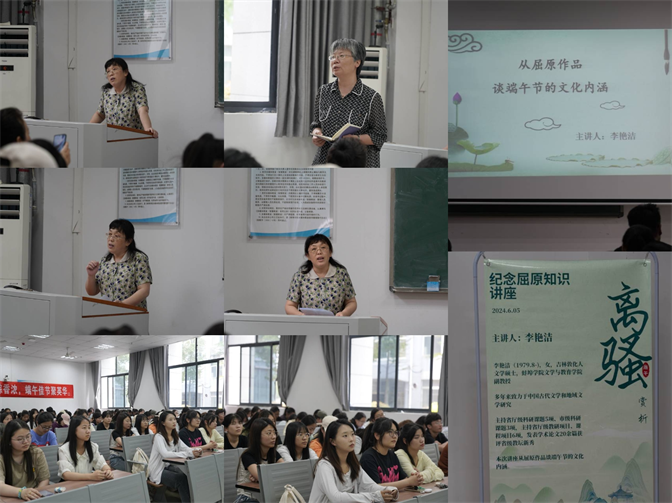 为了引导学生了解端午节,认识屈原,弘扬屈原伟大的爱国主义精神,6月5日下午2点30分,太阳集团tyc151cc邀请李艳洁副教授于教学楼G104开展了«从屈原作品谈端午节的文化内涵»的主题讲座,23级汉语言文学4班、5班的同学参加讲座。