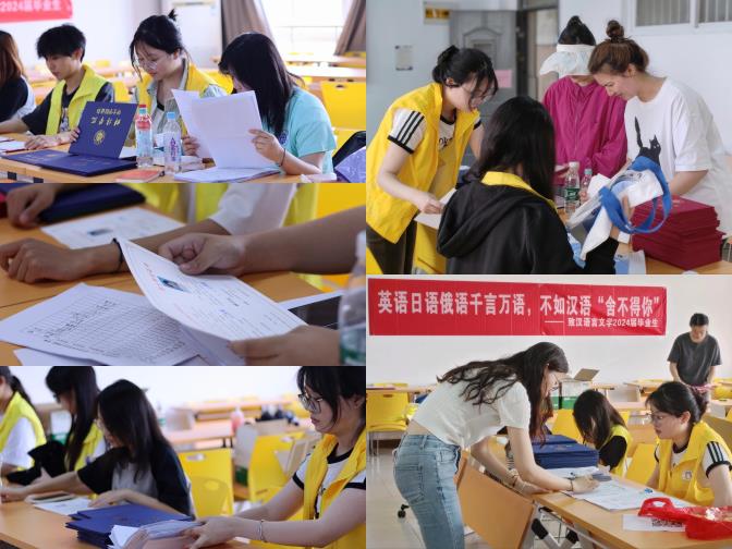毕业离校工作在教学楼B楼开展,团总支青年志愿者协会精心布置了会场,悬挂着温馨的祝福条幅,并循环播放赠送各班的电子纪念相册,毕业班辅导员们认真引导毕业生办理毕业相关手续并送上了谆谆嘱托和美好祝愿,并为每个毕业生发放纪念布袋和水;学生干部满怀激情,为毕业生们提供高效、周到的服务,协助辅导员办理离校手续,仔细核对毕业生的离校信息,保障了各项工作顺利完成。