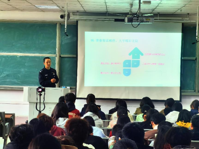 张警官首先通过某211大学毕业生因经手他人赃款且掩盖、隐瞒信息而获刑的案例,告诫同学们要懂法知法、遵法守法,避免因法律意识淡薄而让大好前程毁于一旦。张警官还探讨了新媒体时代如何处理好青少年与网络之间关系问题,并介绍了刷单、冒充客服、网络交友等网络诈骗类型,提醒同学们要提高警惕,注意保护个人信息。在最后的互动环节,张警官回答了同学们关于大学规划、如何反诈和就业报考等方面的问题,并留下了联系方式欢迎同学们问询。