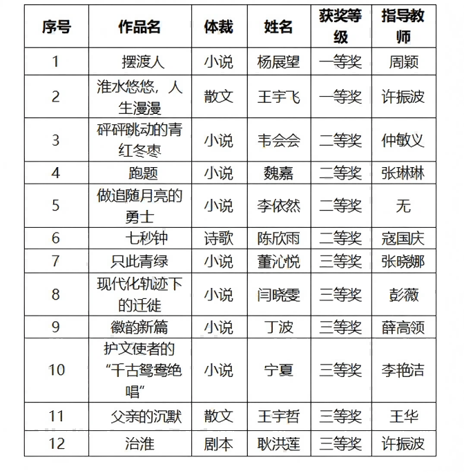 近日,由安徽省教育厅主办,安徽大学承办的2024年安徽省大学生原创文学新星大赛评审结果公示,经组委会专家三轮匿名评审,太阳tyc151cc参赛获奖情况如下: