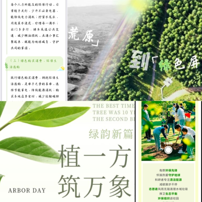 本次大赛以绿色校园建设为主题,要求参赛者创作富有创意的推文作品。赛事一经启动,便激发了同学们的无限奇思妙想。《绿动未来,你我同在》通过视频展示泥土触感、工具碰撞声,强化“真实参与感”,营造出身临其境的感觉。《栽种一树浓荫,遥敬春色万里》设计了3-5款竖版海报,印有不同环保标语,并“场景+行为+数据化成果”的方式增强说服力,传播绿色环保理念。《绿意同行,共筑梦田》,其描写了不同身份的人物的环保故事,用切换、拍摄、拼图等形式展示画面,表达了对绿色生活的深刻理解。