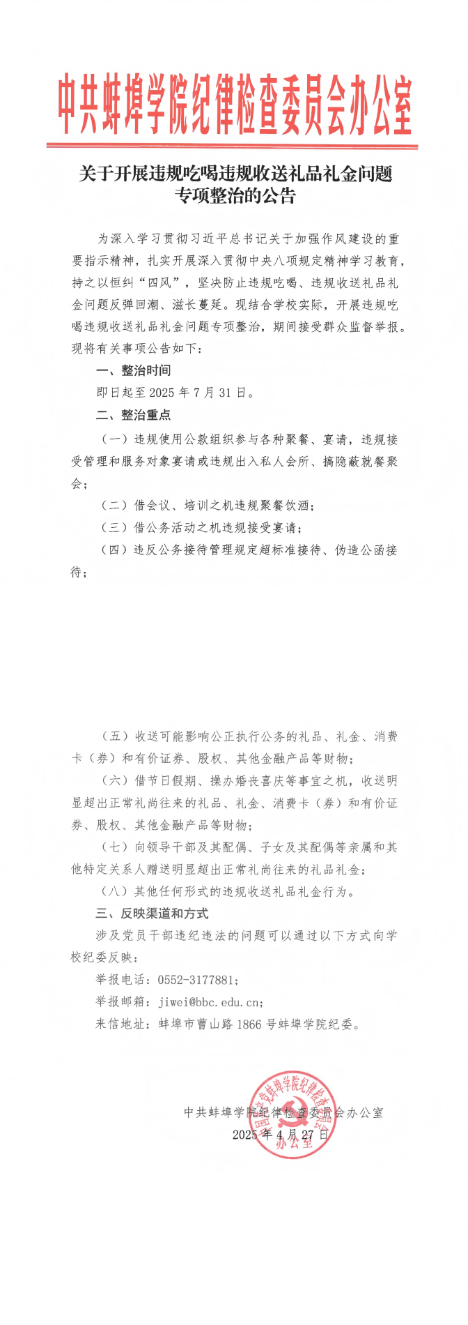 关于开展违规吃喝违规收送礼品礼金问题专项整治的公告