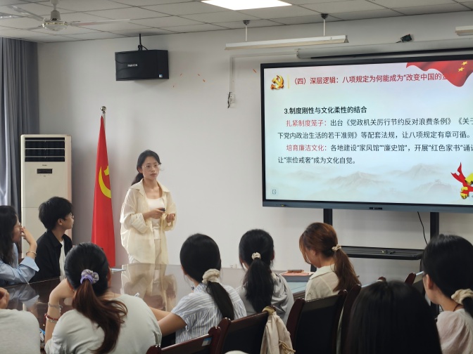 宣讲中,王春壹开篇点明“中央八项规定是全面从严治党的破题之笔”,通过回溯规定出台背景,解读其在正风肃纪、重塑党风政风方面的关键意义,并以真实案例展现规定实施后的显著成效,让学生党员深刻认识到八项规定的重要性。随后,围绕“大学生党员如何践行八项规定”,王春壹从思想自觉、行动标杆、三维成长路径三方面展开,引导学生党员筑牢思想根基,将中央八项规定精神融入日常,在学习生活中争做勤俭节约、求真务实的表率,带动身边同学崇廉尚俭,为党风政风建设注入活力。