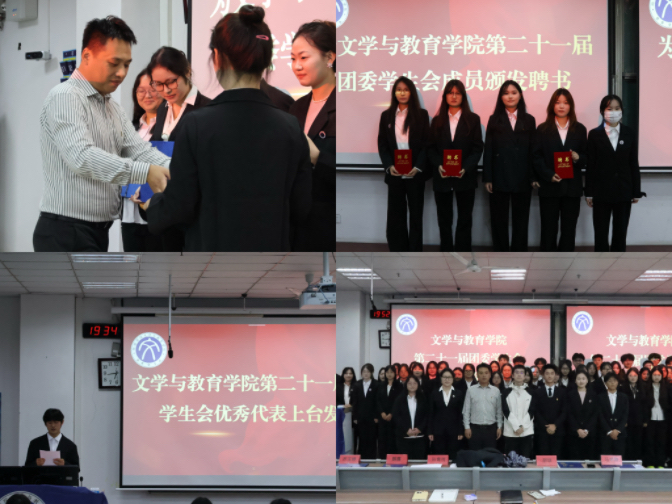 首先,上届主席团过去一年取得的工作成绩进行总结报告,表达了对组织未来发展的祝福。随后,上届主席团为上届全体组织成员颁发聘书,并为优秀部门成员颁发荣誉证书。最后,团委书记孙青传对各组织过去一年的工作进行总结与表扬,也对新一届全体组织成员寄予了殷切期望