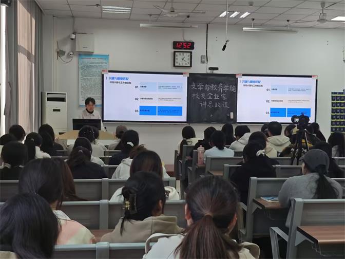 胡凯以“深耕当下 奔赴前程”为主题,分享了自身从业经历、创业历程以及取得的成果,并对毕业生工作选择和创业方向进行探讨,鼓励同学们进行未来职业规划,并在在校期间丰富充实自己。本次活动,胡凯围绕“大学生涯规划”、“创业就业”“职场指导”等块面,与我院学生展开了一场有温度、有深度、有力量的思政对话。